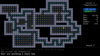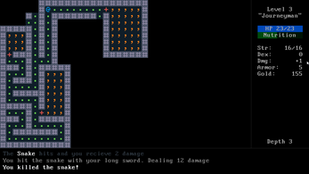 Neat little game! I managed to beat it on my first attempt thanks to liberal use of magic and a lotta enchant weapon/armor scrolls used on a long sword and reinforced armor. I think my armor got to +8 for a total of 16 AC a bit before I got the amulet which let me just facetank dragons in melee as they could barely hit me enough. During the trek back to the surface I actually tried to vorpalize my sword again which broke it, so I had to bash monsters with my crossbow for a while! That ended up being pretty tense and fun. Weird thing though — early on, I found a ring of slow digestion, and after a bit, I never lost any hunger again, even without any rings on.